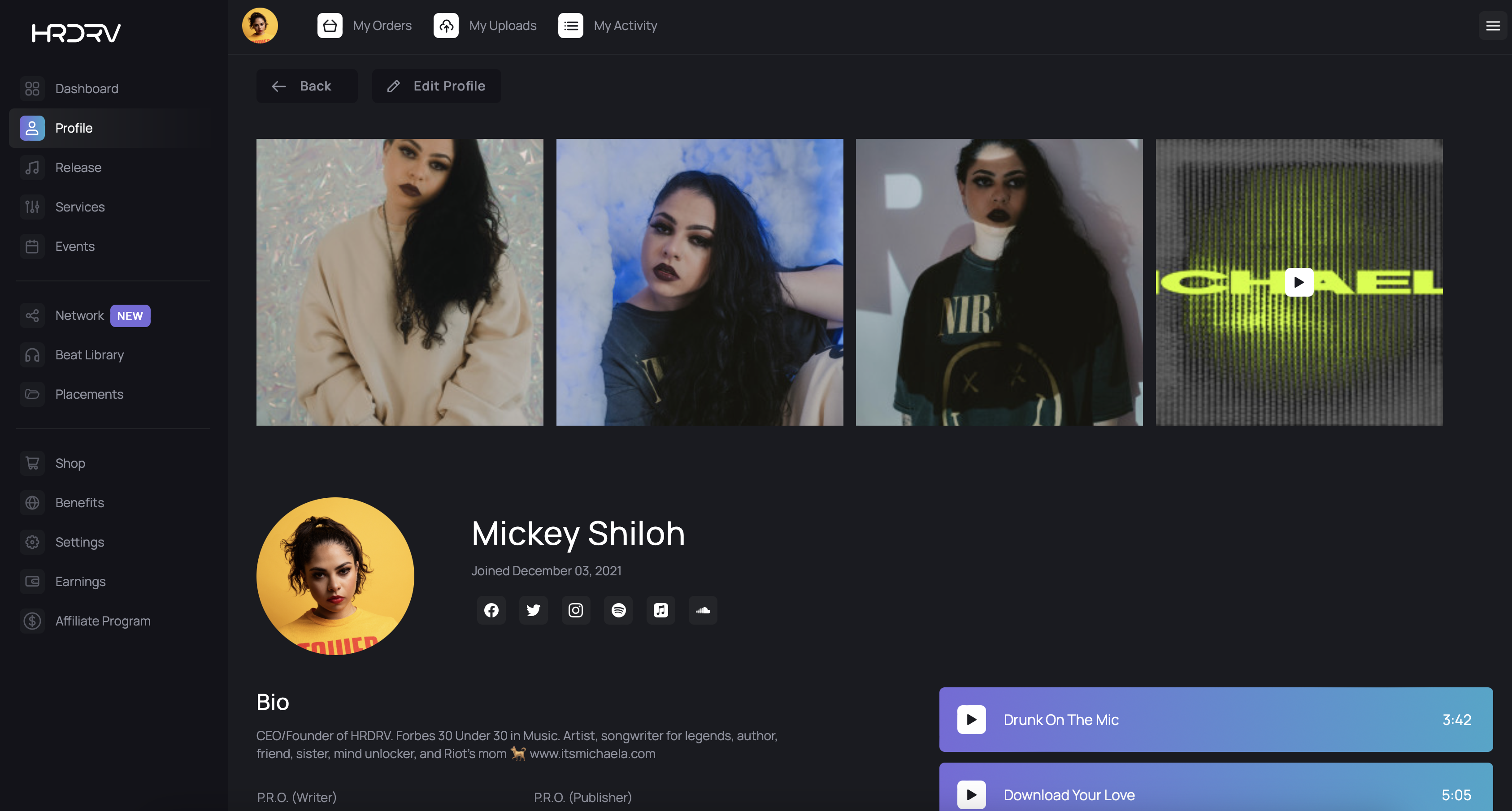 HRDRV is the world’s first community-based record label meets music industry software, founded in 2019 by Forbes 30 Under 30 Lister and Multi-Platinum Selling Songwriter, Michaela “Mickey” Shiloh. The platform offers global distribution, cover artwork, TV/Film placements, mixing & mastering, promo videos, and a free beat library to its artists, producers, and songwriters.